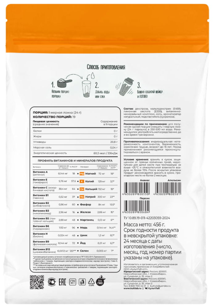 Ингредиенты: декстроза, мальтодекстрин, лимонная кислота, ароматизатор натуральный и идентичный натуральному, витаминно-минеральный комплекс, подсластитель - сукралоза.